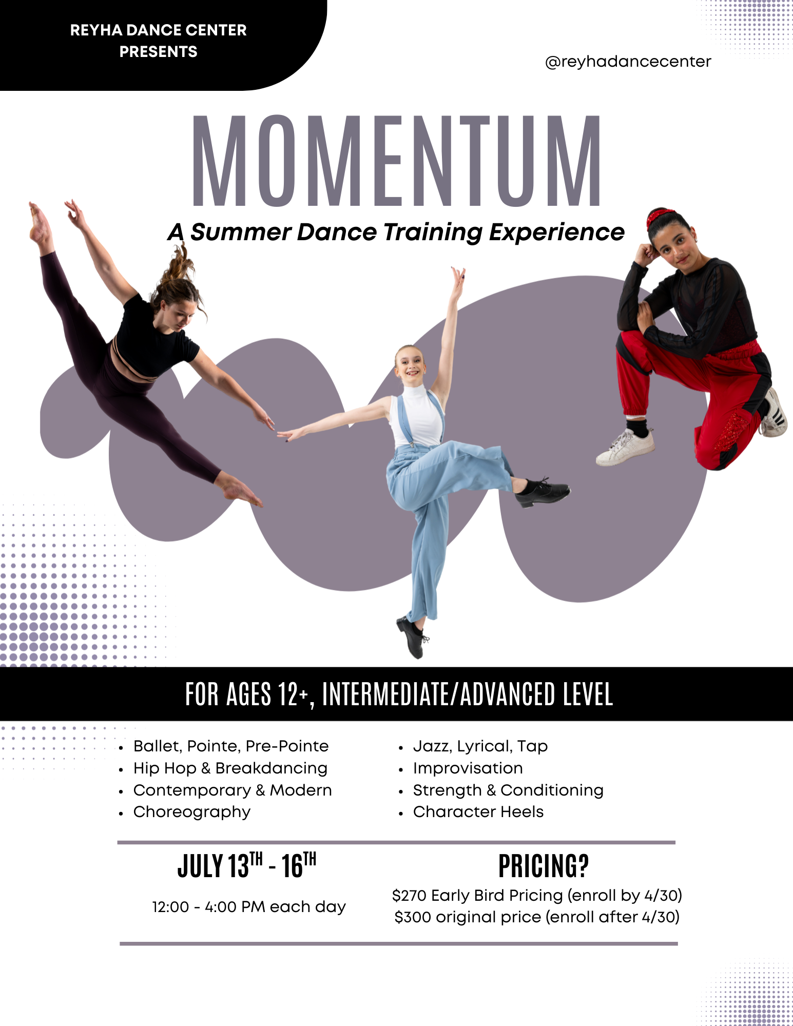 $50 non-refundable deposit will be charged upon registration. Remaining amount will be charged on July 1st. Join us for MOMENTUM: A Summer Dance Experience. Growth happens when dancers build momentum. This immersive training experience focuses on strengthening technique, musicality, and performance skills while creating forward motion in each dancer's development. MOMENTUM is designed for intermediate & advanced teen dancers to leave the summer stronger and ready to launch into the next season. Dance Styles Include: Ballet, Pointe, Pre-Pointe, Hip Hop, Breakdancing, Contemporary, Modern, Jazz, Lyrical, Tap, Choreography, Improvisation, Strength & Conditioning, Character Heels.
